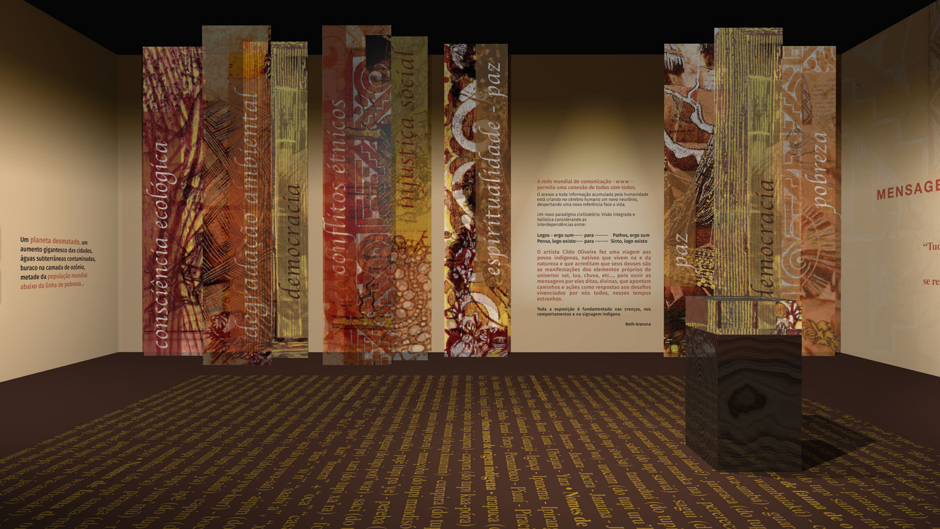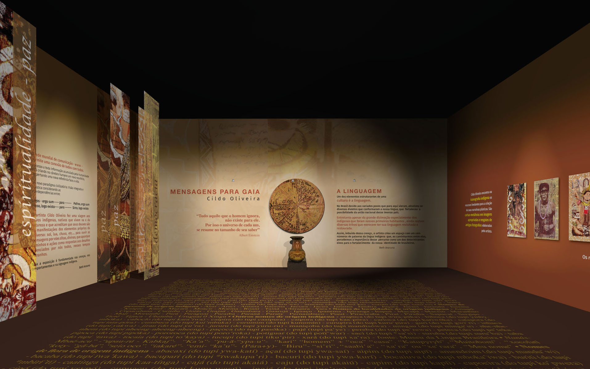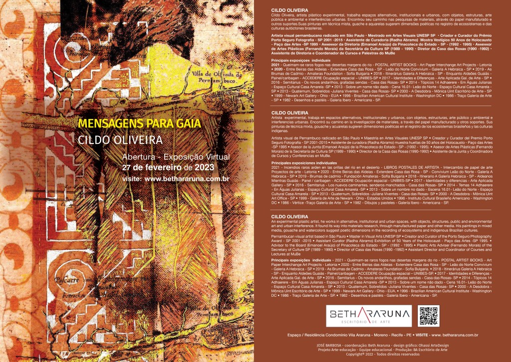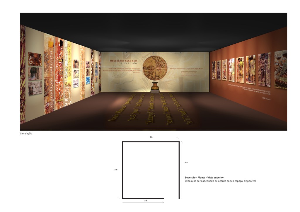 O artista Cildo Oliveira fez uma viagem aos povos indígenas, nativos que vivem na e da natureza e que acreditam que seus deuses são as manifestações dos elementos próprios do universo: sol, lua, chuva, etc…, para ouvir as mensagens por eles ditas, divinas, que apontam caminhos e ações como respostas aos desafios vivenciados por nós todos, nesses tempos estranhos.