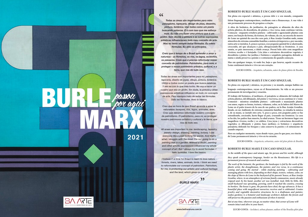 O Beth Araruna escritório de arte, se une as comemorações de 2021, dedicado pelo município de Recife ao artista Burle Marx, através da exposição virtual Burle Marx passou por aqui… e convida a uma reflexão sobre a sua dimensão artística, profissional e humanística.