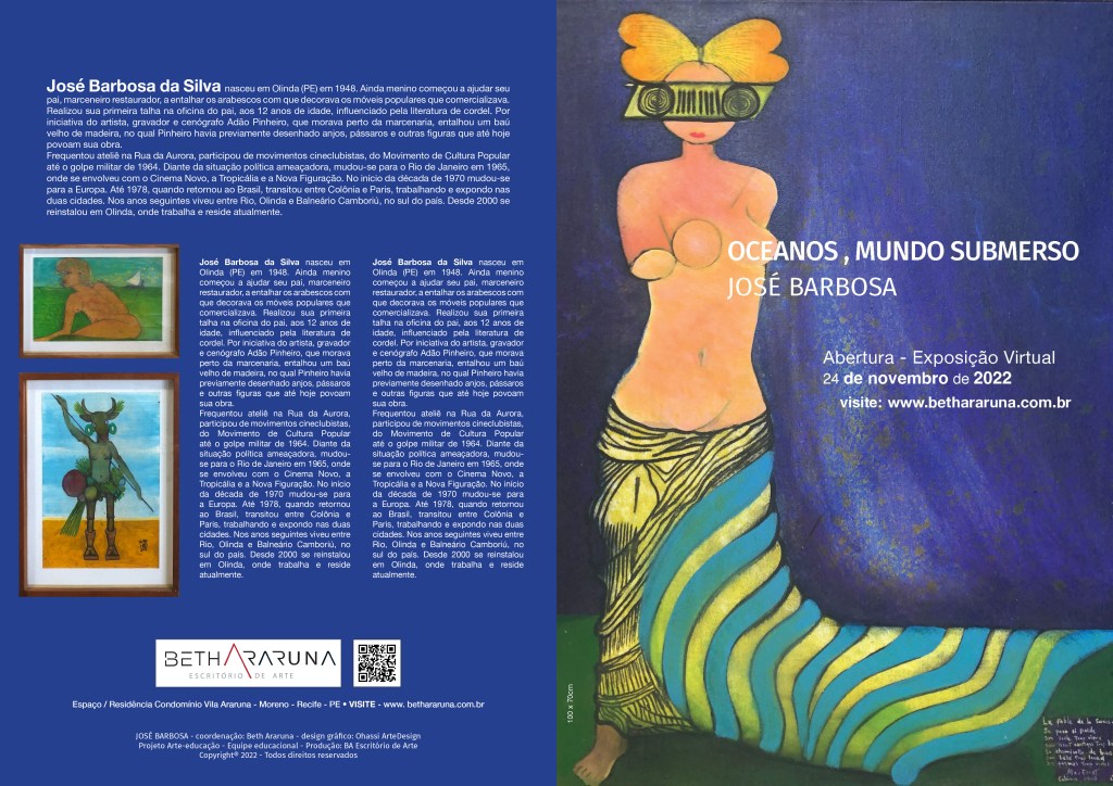 Artista de várias técnicas de expressão: pintura, desenho, gravura, talha, escultura, José Barbosa, começou no ofício ainda criança em Olinda, entalhando móveis. Experiência que influenciou sua produção posterior.