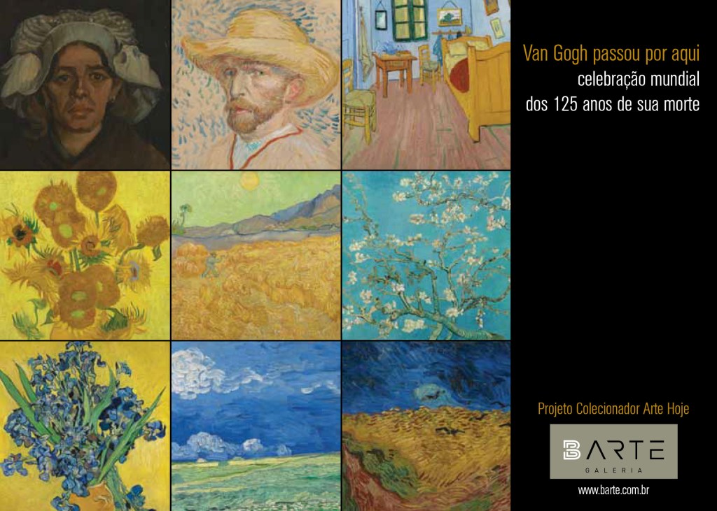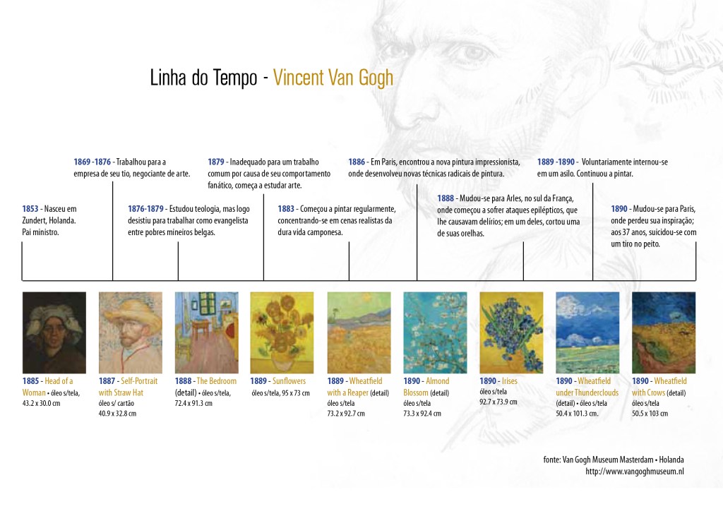 artes gráficas: projeto exposição, sinalização, convite, arte linha do tempo Van Gogh, coleção de postais